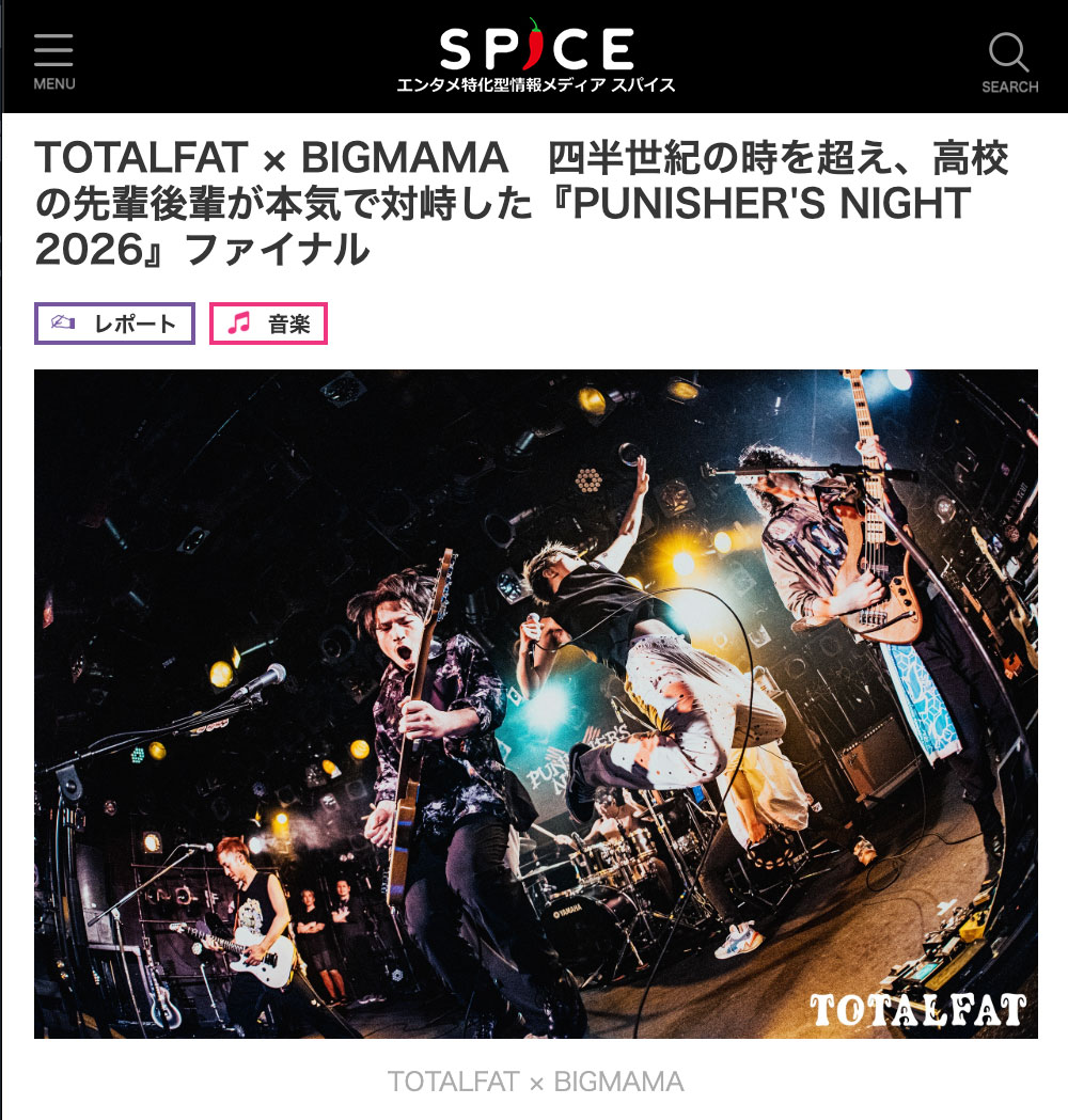 2026.01.30BIGMAMA#TOPICSBIGMAMA、SPICE ライブレポート掲載1/24 (土) 渋谷CLUB QUATTROにて開催されたTOTALFAT Presents「PUNISHER’S NIGHT 2026」のライブレポートがSPICEに掲載されました。ぜひご覧ください。https://spice.eplus.jp/articles/343654