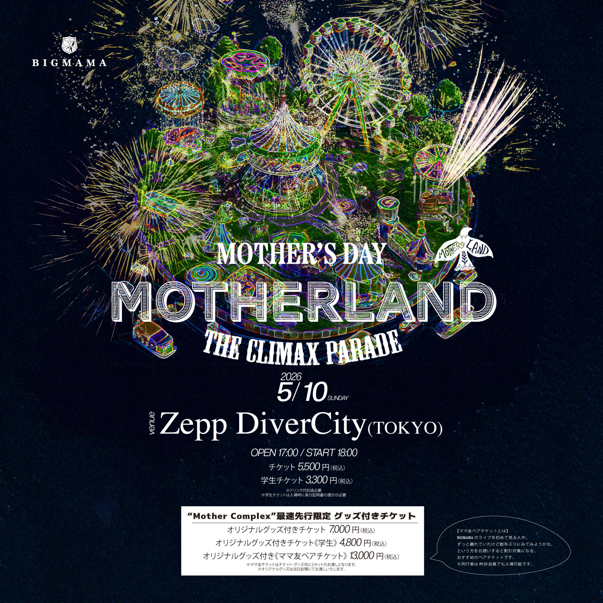 ※ママ友ペアチケットはライブ初体験の方や久々にライブを観たい方と一緒に楽しめる特別チケットで、同伴者はFC非会員でも入場可能です。